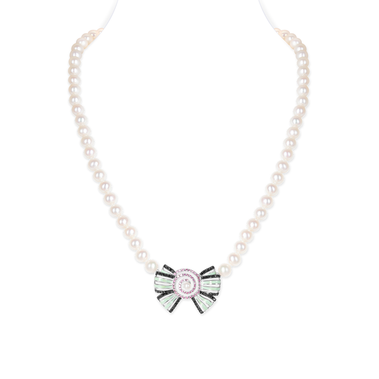 Embrace the whimsical charm of the coquette aesthetic with the multifunctional Coquette Dream Necklace/Brooch. A playful bow, adorned with a luminous pearl sitting in the middle of a pink sapphire rose, lined by Black diamonds and playful colours of enamel, makes it a statement piece perfect for those who love feminine maximalism. This breathtaking piece transforms from a captivating necklace to a dazzling brooch, offering endless styling possibilities