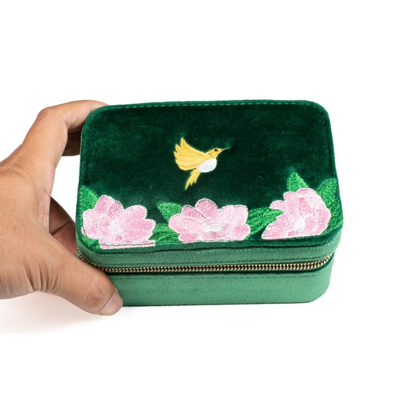 Embroidered with the Flying Bird, a sign of freedom and a beautiful blooms over the lid, it will brightens up your dressing tables or travel bags when you finally make that trip.