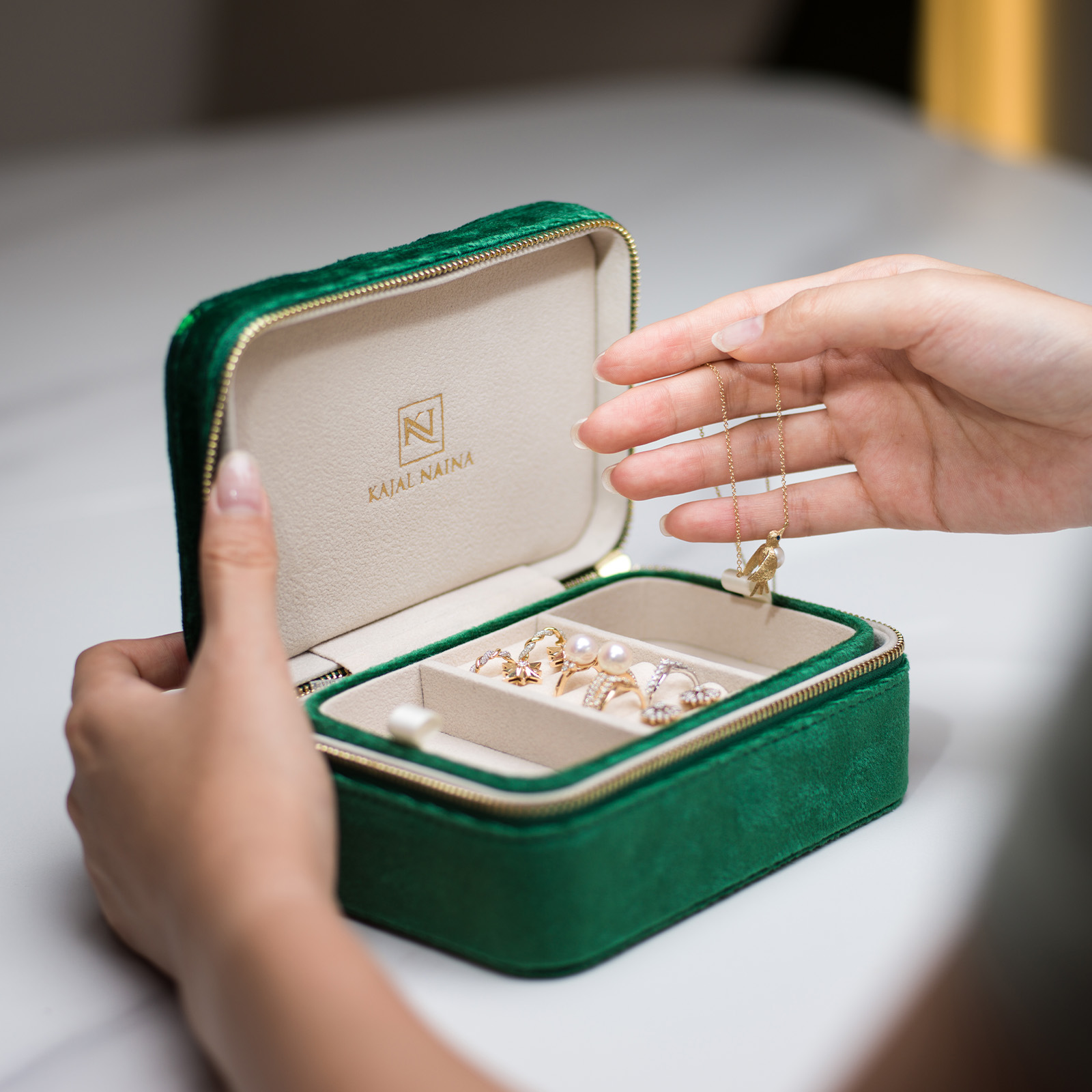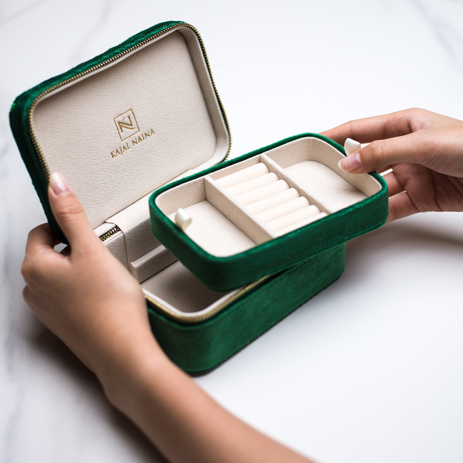 Made from luxurious Green velvet, KN jewellery case is perfect to showcase on your dressing table, and are also practical to accompany you on your travels.