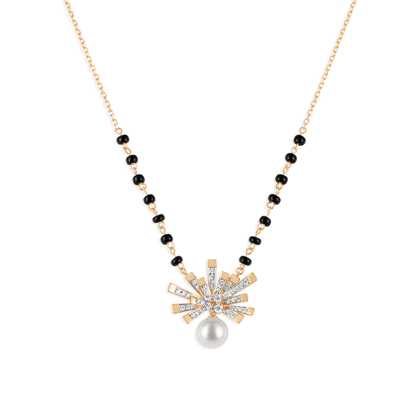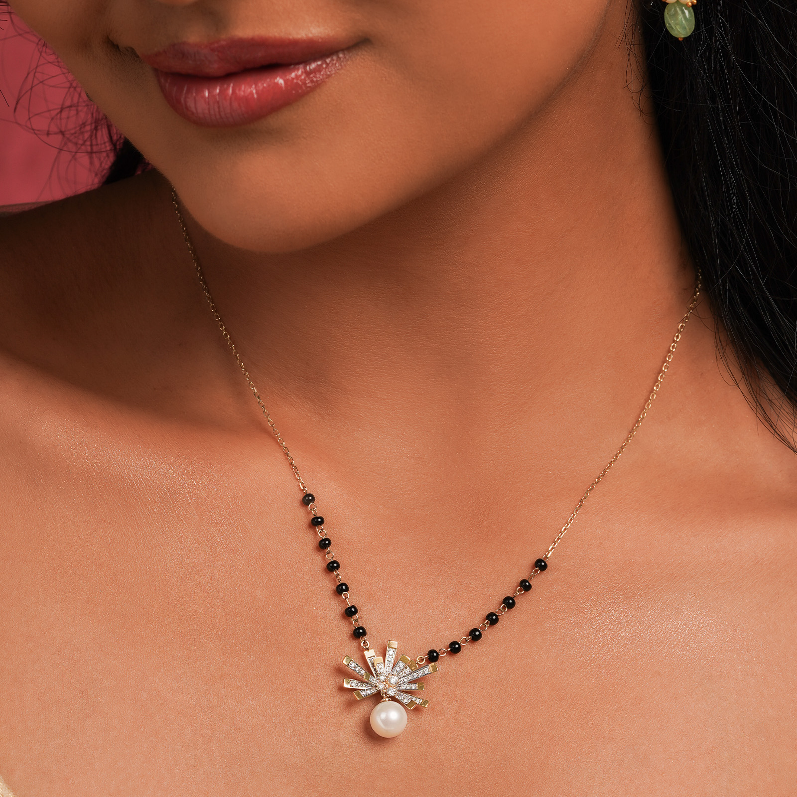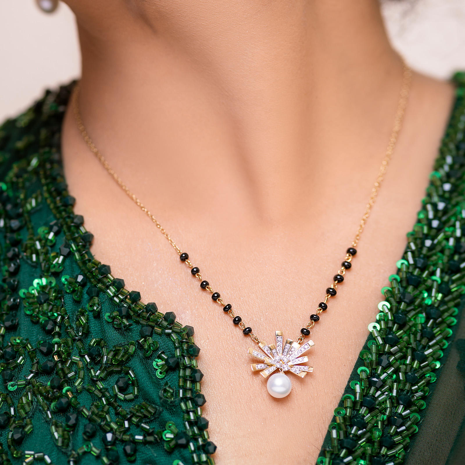 Our Makhmali Phool Mangalsutra, inspired by the vibrant Gomphrena globosa or “Makhmali Phool” in Nepal, captures love’s enduring flame and the burst of blessings it brings. Crafted in 14k yellow gold, this exquisite piece features a pendant mirroring the flower’s fireworks display, with radiant white diamonds mirroring the blooms’ hues and a shimmering pearl symbolizing joy and celebration in a relationship. Makhmali Phool garlands symbolize longevity, prosperity, and unbreakable sibling bonds during Tihar/Diwali, showcasing the flower’s enduring nature and vibrant color even after drying, reflecting the everlasting love in marriage. This mangalsutra embodies the energy and excitement of the Gomphrena globosa ‘Fireworks’ cultivar, representing passion, love celebration, and blessings in a lifelong journey together. Beyond adornment, it testifies to love’s enduring nature, growing stronger with time. Wear it to symbolize commitment, vibrant love, and a continuous burst of blessings and joy in your shared journey.