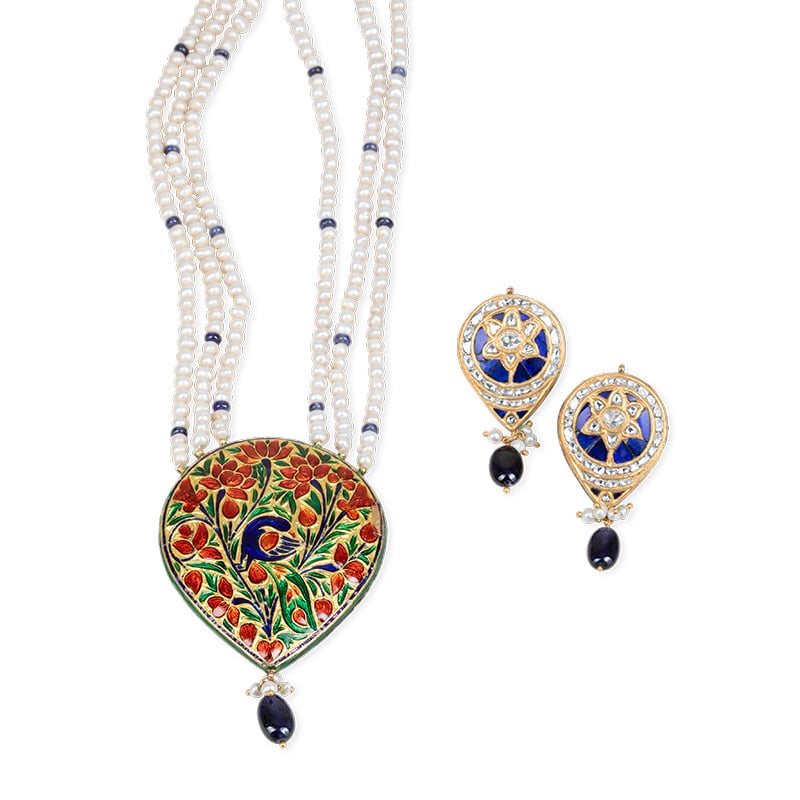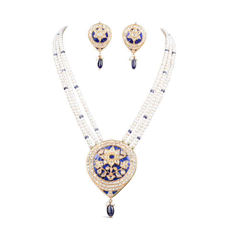 Noor Blue Pearl Long Necklace + Earring Polki Set A