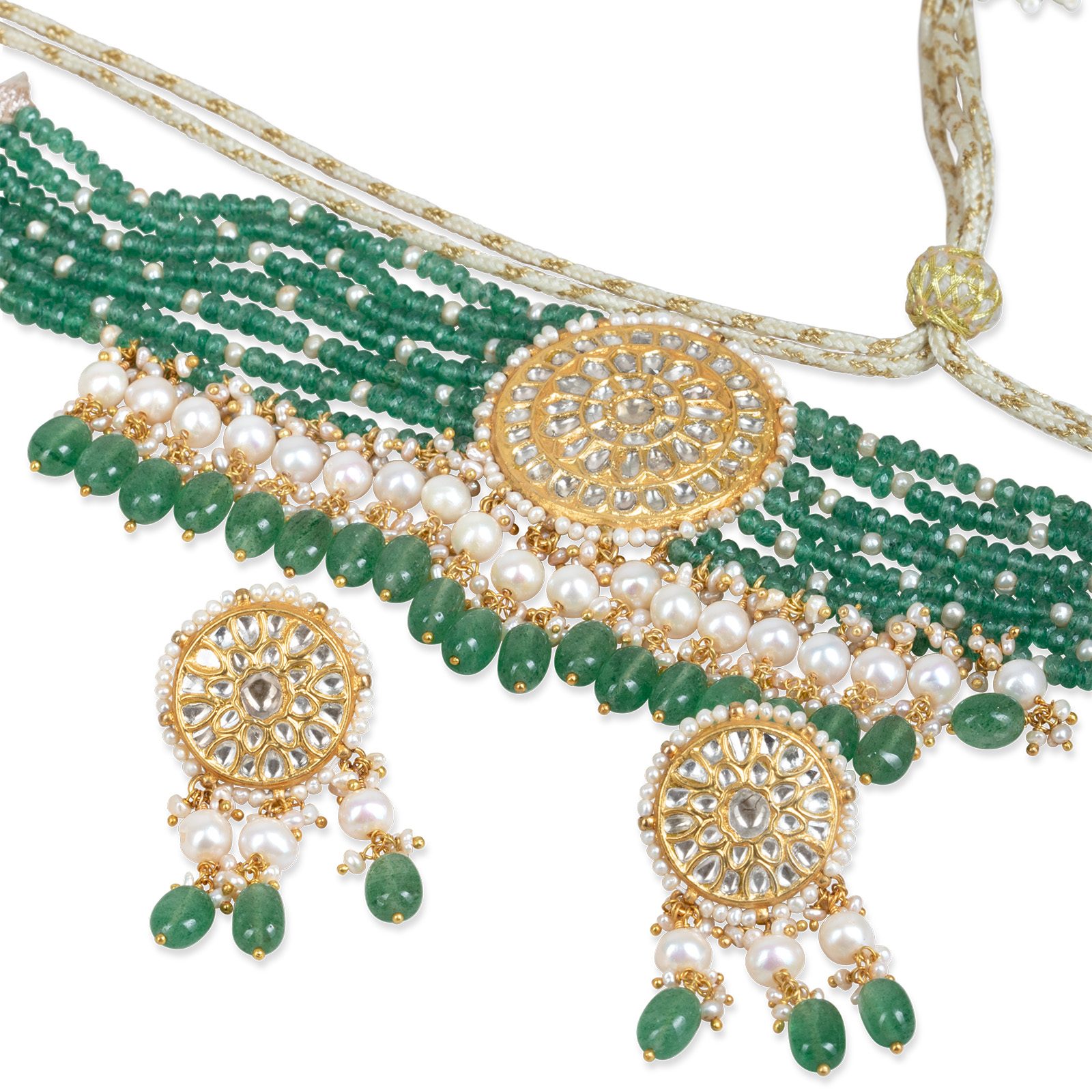- A verdant symphony of Polki diamonds and emerald accents, reminiscent of the lush gardens surrounding the Mughal palaces.