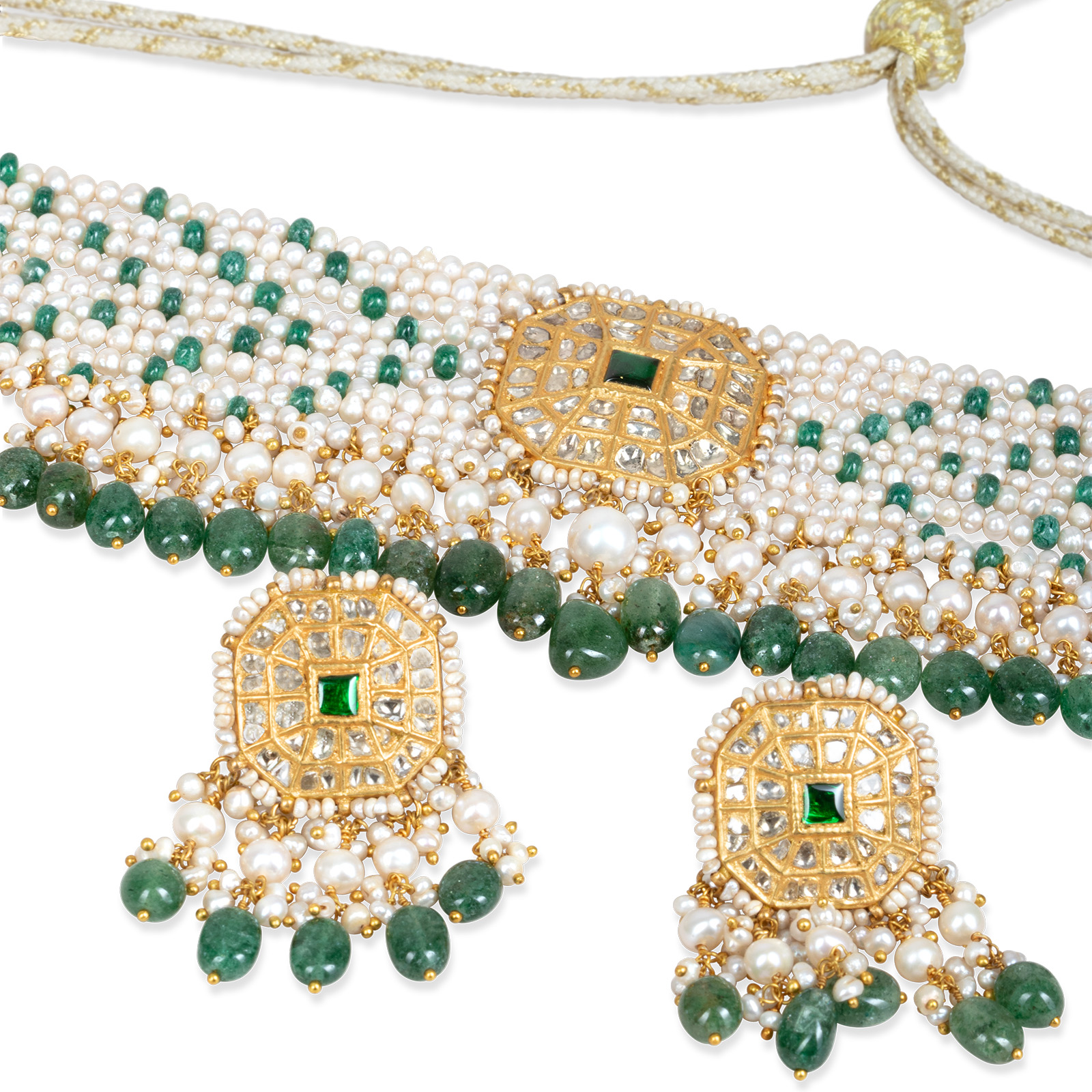 A verdant symphony of Polki diamonds and emerald accents, reminiscent of the lush gardens surrounding the Mughal palaces.