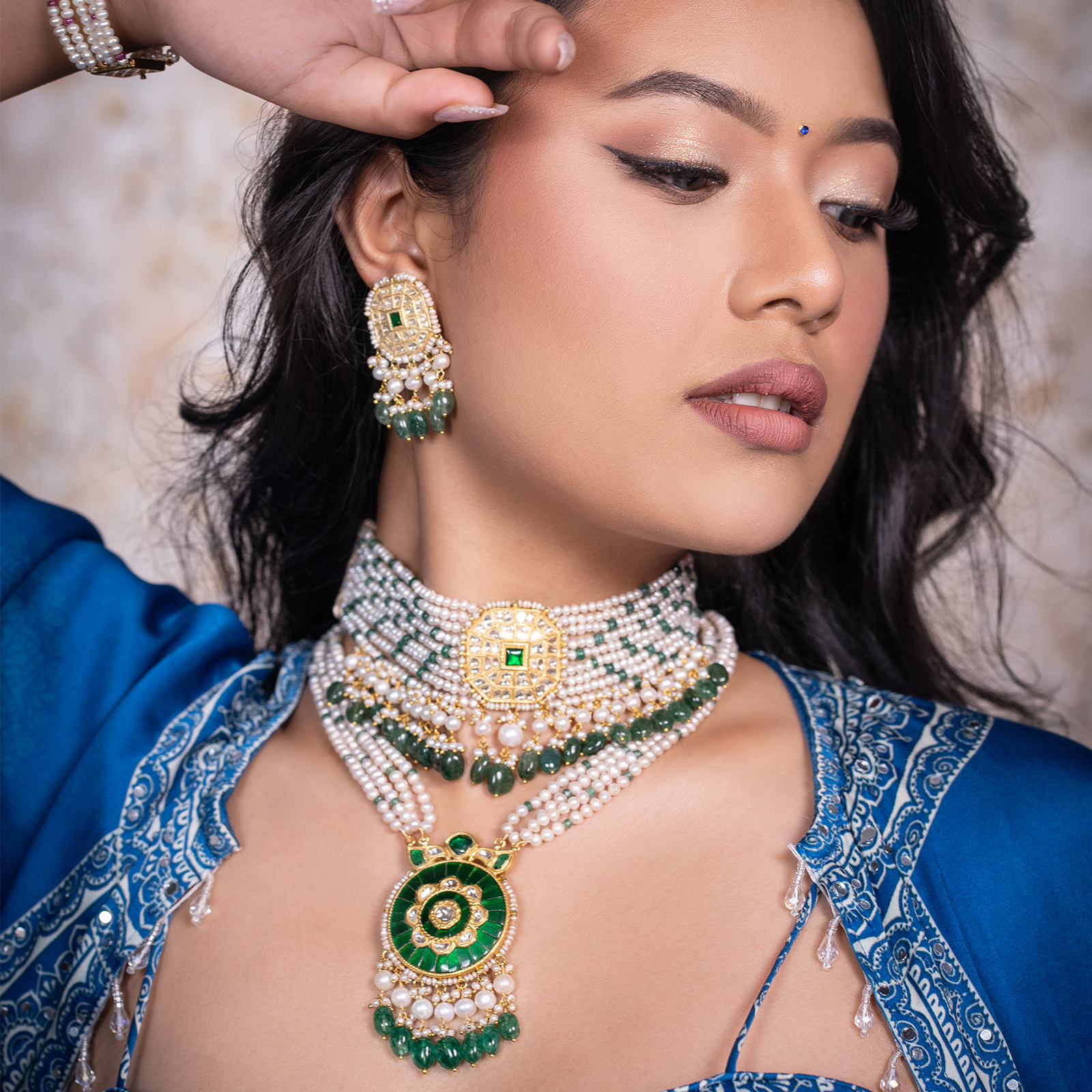 Indulge in the regal allure of the Zeenat Choker + Earring Sets, inspired by the elegance and grace of Mughal queens. Each choker is a symphony of meticulously handcrafted 22K gold, adorned with the brilliance of uncut Polki diamonds and the vibrant hues of coloured gemstones and pearls. The cascading design echoes the intricate architecture of the Mughal Palaces, creating a statement piece that exudes timeless beauty and sophistication.