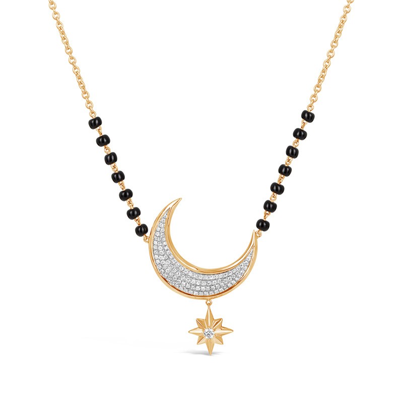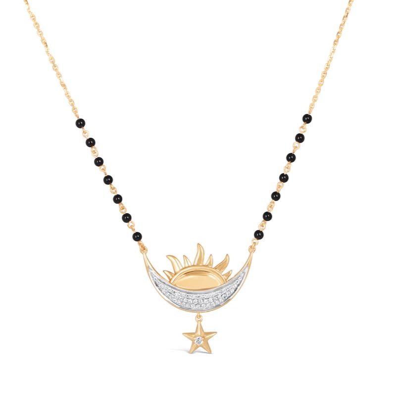 This mangalsutra design is gold in itself and you get to choose from 14K and 18K solid gold. The dainty little diamonds embedded on the moon show the delicacy with which this unique piece is crafted. The length of the chain is similar to other product offerings.