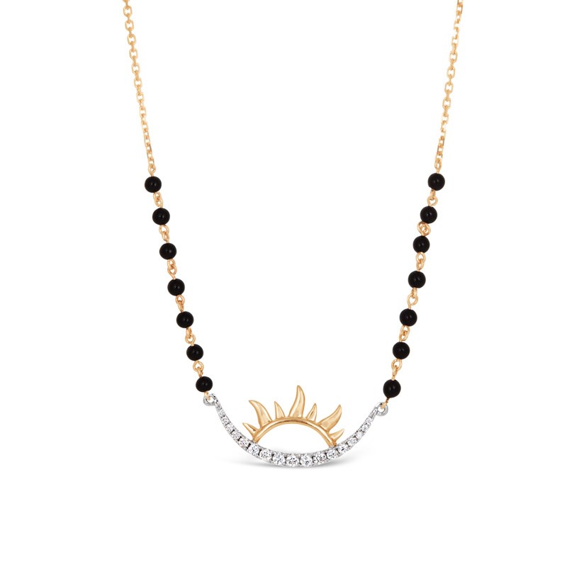 This latest designer gold mangalsutra portrays the moment when the sun kisses the crescent moon. A perfect blend of romantic and beautiful moon signifying wisdom and power with the full of light sun, representing happiness.